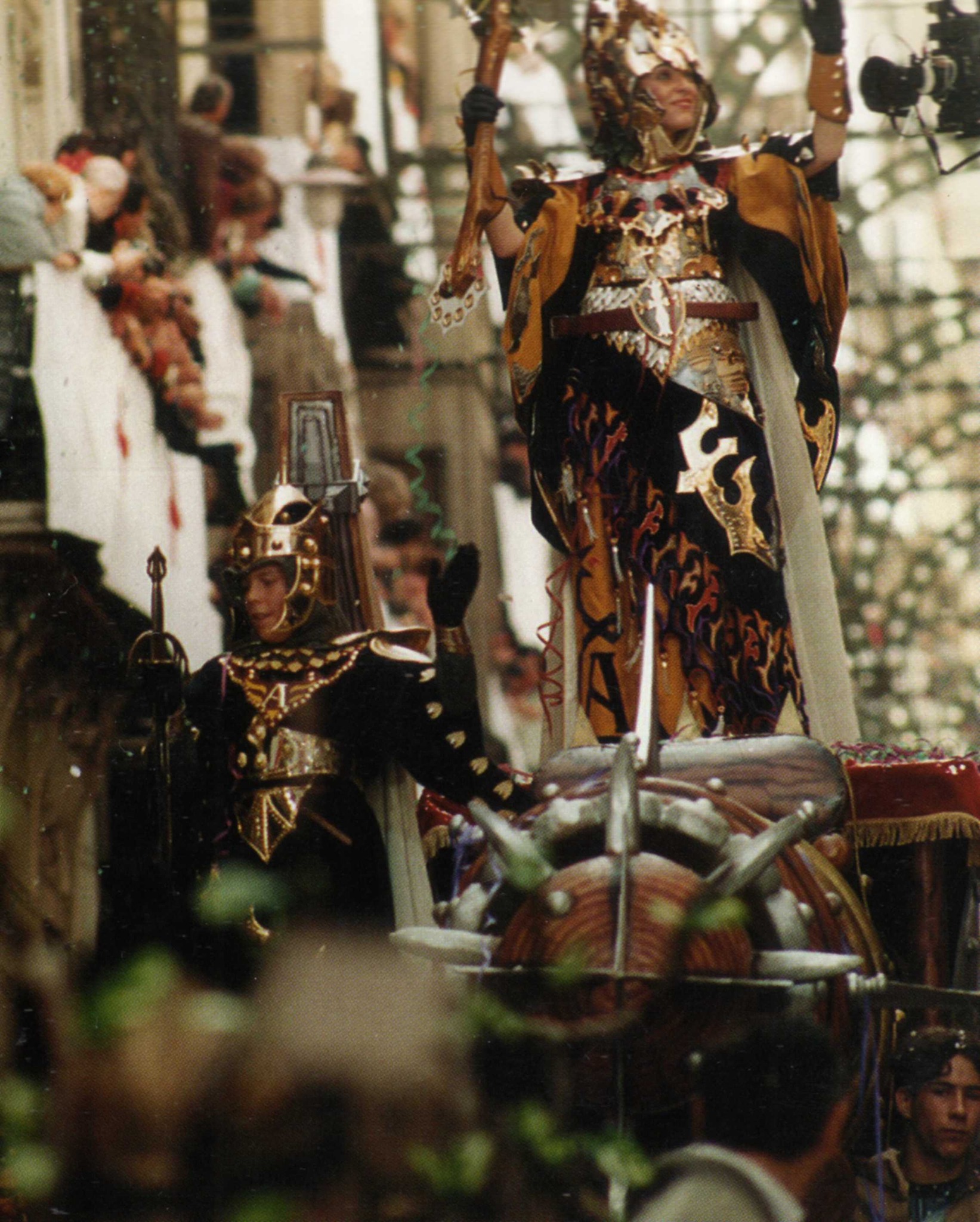 Després de mesos d'agitació i polèmica per la guerra del calendari, les Entrades de 1997 tenien la responsabilitat de calmar els ànims i fer oblidar els problemes de la festa per poder viure-la amb esplendor. Esplendor que la filà Asturianos va oferir en la seua capitania cristiana. Senzilla, guerrera i no massa extensa, però plena de sorpreses. La primera d'elles un grup de xiques que portaven banderoles blaves i verdes amb símbols de la filà. Vestides de gris i taronja movien les banderoles formant una simple coreografia acompanyada de la percussió d'un grup de homes de roig i negre. Dins d'unes gàbies apareixien tancats coloms que van ser soltats en la Plaça Espanya. El ballet de Virginia Bolufer amb les notes de la marxa cristiana "Gloria" deixava al públic amb la boca oberta. El vestuari del ballet es componia d'una llarga túnica gris, metall platejat i xarxes de pesca roges que provenien de la Vila Joiosa. Les melenes roges li donaven l'agressivitat que un ball tan guerrer necessitava. La guàrdia del capità amb vestimentes guerreres on destacava un impactant casc obria pas a la carrossa del capità i els cavallers. El dissenyador Luis Sanus va pensar en una falda que combinava taronja i negre per al grup de dones. Els cavallers del capità portaven un casc quadrat molt original i un trage en negre i taronja molt metàl·lic. Sobre una gran espasa va aparèixer el capità triomfant. Els Asturianos van confiar en Federico Agulló Pericas per a que desempenyara el càrrec de capità cristià 1997 amb dignitat. El trage fet per Jordi Sellés era una obra d'art, el color de la filà, el taronja, cobria la túnica del capità i damunt nombrosos metalls i cuero marró al cinto d'on penjava una gran espasa. La capa era roja i el casc, fet de metall, acabava en punta. La marxa cristiana interpretada era "Cid". Els escuts de les catorze filaes cristianes d'Alcoi obrien pas a les dames de la favorita a cavall i de color roig que portaven una llança i un casc de metall. Davant la favorita anava un nou ballet, aquest d'Ana Botella, que representava els boscos asturians. Les ballarines anaven cobertes de fulles amb un casc pesat i vestides de verd i marró. El maquillatge anava acord amb la vestimenta. Entre els moviments tranquils dels arbres s'intuïa la carrossa de la favorita i el rodella. Els fills del capità portaven trages guerrers de Luis Sanus amb metall on predominaven el negre i el taronja. Es van acompanyar de la coneguda peça musical "Caballeros de Navarra" i darrere la banda de música anaven unes llanceres de taronja i blau. Un grup de dones nobles asturianes i altre de guerreres vestides de roig envoltaven una tenda de campanya per dormir quan el fred es fa l'amo d'Astúries. Però abans de l'esquadra de negres, la filà Asturianos encara tenia un as a la manega. Uns gaiters procedents d'Oviedo li donaven el toc asturià al boato del capità cristià. El grup feia sonar instruments típics d'Astúries com la gaita, interpretant "El Garrotín". La filà Asturianos va tindre la sort de desempenyar la capitania cristiana en una època en la que la música celta estava de moda i això va fer créixer a la filà en popularitat. Totes les filaes noten un augment de popularitat durant els anys de càrrec. L'últim grup de dones de la capitania cristiana 1997 portava llançes amb la creu dels cristians. Els materials que Luis Sanus va utilitzar per aquest grup va ser el metall, la tela ocre i una llarga capa negra. L'esquadra de negres era molt colorista. Utilitzava els colors blau i negre a més a més de pells d'animals, cuero marró, el groc de l'espart i el roig d'unes plomes col·locades al voltant del coll i sobretot al casc de grans dimensions. La capa estava formada de fils blancs i d'ella penjava una gaita. Els músics tocaven per a l'esquadra "Als cristians". Sense cap dubte una preciosa esquadra dissenyada per Roberto Pérez. Un senzill grup masculí amb túniques blaves arrastraven una catapulta que llançava roques. L'identificatiu color taronja es va veure moltes voltes al boato i per supost també era el protagonista de l'esquadra oficial, amb la marxa cristiana "A la Creueta". Un grup de xiquets i una ballesta tancaven la bèl·lica capitania asturiana.