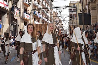 Els nervis es desbordaven al Partidor al matí del 22 d'abril de 2018. Sobretot la filà Navarros era la que més impacient estava per començar l'Entrada Cristiana, ja que desempenyaven la capitania de les forces de la creu. La desfilada començava amb la música de "L'ambaixador cristià" acompanyant a l'esquadra oficial de la filà Navarros. El boato s'iniciava amb unes druides que portaven banderes. Les fulles verdes i les teles de color gris predominaven en el primer trage del dissenyador Antonio Aracil. El creador de la capitania cristiana 2018 també va pensar en caputxes per a un grup de bruixes del bosc. Vestien amb pells i teles en tons blaus, verds i marrons. Als ulls, maquillats de color roig, es notava l'emoció d'aquestes bruixes al escoltar l'obra musical "Mussa". Unes amazones a cavall portaven trages de color marró i tostat i uns cridaners tocats amb banyes i pell de mapatxe. 2 minotaures capturaven als xiquets i els empresonaven dins d'una gàbia. En aquesta gàbia terrorífica els xiquets vestits amb sacs esperaven l'hora del sacrifici. D'aquest tenebrós ritual s'encarregava un fauno sobre un gran crani de cérvol. Davant de la carrossa ballava un akelarre estrambòtic que feia por. Tot el conjunt atemoria al més valent i la peça musical "Sorginak" tenia part de la culpa. Les ballarines estaven maquillades com zombies i mostraven unes lentilles blanques inquietants. La roba estava formada per teles destrossades de tons grisos i negres. Les bruixes es movien com a boges amb els seus pentinats desfets. Ossos i calaveres servien d'amulets per a les festes nocturnes de l'akelarre. Una reinterpretació actualitzada dels anteriors ballets de la filà Navarros en les capitanies de 1990 i 2004, tots fets per la coreògrafa alcoyana Ana Calvo. Seguint les al·lusions a càrrecs anteriors, la filà Navarros va recuperar el grup folklòric ancestral Zampazar. Dins de la part tribal del seguici també van haver cavalls i un grup de moros encadenats. El so de les campanes enganxades a l'esquena dels representants culturals de Navarra espantaven als esperits malignes. Al nombrós públic li va sorprendre el moviment brusc dels pastors amb pells d'ovella i curiosos barrets. Un personatge mitològic de Navarra asustava als espectadors amb el seu vestit de llana. Al voltant d'una taula amb menjar els veterans de la filà disfrutaven del matí amb senzills trages en blau i negre on no faltava el símbol de la flor de lis. Antonio Aracil va intentar que tots els trages de la part medieval del boato foren fidels a l'època històrica. I ho va aconseguir amb el grup d'arqueres amb túniques de color blanc i verd. Un palanquí per a disparar fletxes precedia al grup de ballesters. Portaven una túnica negra i calces de color roig o groc. La cotamalla i el casc de metall destacaven pel seu realisme. Els ballesters lluïen a les esquenes uns gran escuts amb símbols heràldics. Un carro amb la bandera de les cadenes de Navarra estava envoltat de monjos ermitans amb el seu hàbit. Un reduït grup de guerreres amb trenes mostraven al públic la simple túnica dividida en 2 colors: Blanc i magenta. Darrere d'un grup de gaiters desfilaven soldats i escuderes a cavall. Les dones destacaven pel trage de cotamalla gris i unes enormes escuts redons de fusta a l'esquena. Les abanderades blaves portaven un dels trages més bonics i a l'hora austers de la capitania cristiana 2018. A la carrossa del teatre de titelles els xiquets disfrutaven de l'Entrada llançant confeti. Saludaven orgullosos amb els seus trages en tons morats. El Conservatori de Dansa d'Alcoi va preparar una exquisida coreografia al ritme d'instruments de percussió que les pròpies ballarines tocaven. La banda tocava "Seduïts per la cort", una peça musical d'Àngel Lluís Ferrando estrenada fa 10 anys, en la capitania cristiana de la filà Alcodianos. Les princeses portaven trages de diferents colors: Rosa, verd, blau o blanc. Van formar un conjunt colorista i ple de finor que recreava les diversions al pati d'un castell. Un tapís de grans dimensions reproduïa una pintura del segle XIV sobre un banquet de menjars europeus. La part senyorial del seguici de la filà Navarros seguia amb la cort masculina de la favorita a cavall. Els joves lluïen trages medievals que combinaven el color granate amb el blau del tocat i la capa. La versió femenina del trage sols variava per una falda més llarga i els cabells de les xiques adornats amb metalls daurats. Les amigues de la favorita desfilaven junt a ella en una carrossa dominada per un gegant daurat. En lo alt d'una pedra saludava la filla del capità cristià. Somrient disfrutava de la marxa cristiana "Elionor", també composada en 2008. El trage d'Antonio Aracil destacava per les plomes i teles blaves i els metalls platejats repartits per diferents parts del cos. La originalitat del disseny de la favorita va recaure en el casc. Estava format per boletes d'or que protegien la totalitat del cap. Els llancers eren la guàrdia militar dels cavallers i les dames. Amb les seues túniques curtes de color blau i blanc precedien a una imponent carrossa. Les dames apareixien en la part alta de la carrossa, deixant en segon lloc als cavallers que saludaven al públic desde una posició inferior. La carrossa representava el claustre gòtic de la catedral de Pamplona. El trage de les dames era d'una gran elegància i destacava per la caputxa i els brodats. La falda blanca estava separada per una ampla tela blava en la cintura. Al igual, els cavallers vestien com a nobles medieval amb els colors verd, tostat i roig. El calçat estava fet de metall, un metall que també apareixia al casc. Precisament del casc sobreeixien varies tires que semblaven fulles estilitzades. Un detall de pavo real recordava al Centenar de la ploma, una companyia de combat del rei Jaume I. Els cavallers i les dames van desfilar units al so de la triomfal marxa cristiana "Paco Jover". Com a referència religiosa al boato 
