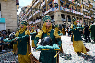 El nou ambaixador cristià, Antonio Delgado, i l'alcaide d'Alcoi obrien l'alferecia cristiana 2023. El motiu d'aquesta novetat era que li tocava a la filà Alcodianos, amb una esquadra de blancs al ritme de la peça musical "Bonus Christianus". Els 40 cavallers de Jaume I tornaven a estar interpretats per xiquets i xiquetes com a la capitania cristiana de 2008. Les túniques ocres amb escuts nobiliaris donaven pas a una roponà femenina també amb simples trages de color negre. Les escuderes del Conde de Cocentaina tocaven la percussió obrint un boato de Santi Carbonell. L'argument anava al voltant del primer senyor feudal de la vil·la medieval d'Alcoi: Roger de Llúria i es podia apreciar el seu escut en l'heràldica de la filà Alcodianos. Un grup de monjos tocaven campanes anunciant la proximitat del Mossèn Torregrosa i de la Santa Creu de fusta. Els monjos portaven hàbits de color verd i caputxes, donant pas a un palanquí que reproduïa l'Església i el Campanar dels Salesians. Perquè molts dels components de la filà Alcodianos són antics alumnes de l'escola. Sonava la peça musical "Cotes" i les guerreres de Panizas portaven trages en tons negres i marrons amb capa roja i casc de metall platejat. El primer ballet de Gabri Amador tenia molta simbologia volent contar la història de la mort dels cristians en les batalles contra els musulmans. Les viudes de les guerres eren les primeres en aparèixer, amb vestits negres, vel en senyal de dol i corones de roses i espines al cap. Amb la marxa cristiana "Ànima i honor" es feia patent el dolor, la fe i la oració cap a Déu per a que perdone els pecats. Les criatures demoníaques portaven faldes de plomes negres i els ossos de l'espina dorsal de la serp del Paradís. Amb un maquillatge espectral i lentilles raptaven les ànimes d'uns joves. A continuació les nobles vestides de verd i groc portaven els atributs de defensa de la filà Alcodianos i destacaven pel barret verd, les capes i els coixins. En una carrossa amb una campana gegant es representava el dia del Judici Final amb un personatge daurat avisant la fi del món. Ballaven la escriba de les ànimes del Purgatori i la senyora justícia amb una espasa i una balança. Els àngels d'ales daurades de la carrossa vestien de blanc i tocaven trompetes per a anunciar l'arribada al cel catòlic. Les calaveres amb guadanyes custodiaven una llarga capa on estava pintat el quadre de Jan Van Eyck del segle XV sobre la salvació del Judici Final. Els veterans de la filà Alcodianos en una plataforma preparaven l'estratègia de guerra formant el consell d'ancians al voltant d'una taula amb menjar. Santi Carbonell va dissenyar trages senzills com el dels arquers amb caputxa verda i pells. Era un grup mixte amb cotamalla gris i túnica blanca amb una creu groga. Carmina Nadal va començar la seua trajectòria coreogràfica en l'alferecia cristiana 1993 i 30 anys desprès la filà Alcodianos continuava confiant amb ella per al ballet de la bufonada. Els joglars feien bromes al ritme de la peça musical "Sàtira" de Francisco Valor. Les ballarines que representaven bufons portaven 3 màscares venecianes en un casc alat amb plomes roges i verdes. El trage estava format per un tutú blanc i brodats de fil d'or però el color principal era el roig de les calces, les mànegues i la capa. Per últim els arlequins aportaven cromatisme amb teles plenes de mosaics, borles i combinacions de colors a l'estil de la ciutat medieval de Paris. L'antifaç i els barrets puntiaguts eren més propis del segle XV, però el ballet de Carmina Nadal pretenia ser un teatre sense tantes al·legories com al ballet de Gabriel Amador. Darrere l'efecte òptic del ballet apareixia una catapulta i els defensors de Calàbria amb trages de cuero marró, manegues ocres i capa roja. Els carros amb espases s'aconseguien gràcies a "La Forja" i els ferrers amb martells treballant sobre una carrossa amb tambors. Els destralers de Na Saurina d'Entença amb túniques en verd i negre protegien la carrossa de les dames i la favorita. La germana de l'alférez cristià portava un trage elegant de Santi Carbonell i saludava tímidament amb un ceptre. La falda verda i els brodats daurats anaven a conjunt amb el trage auster de les dames, també en tons negres, verds, grocs i daurats. La carrossa de la favorita tenia molts ciris, mentre que la carrossa dels infants recordava a la Torre Na Valora del centre històric d'Alcoi. El contestà Francisco Valor havia composat la "Suite Alcodiànima" en 2021 per a tot el seguici de l'alferecia cristiana i les dames van estrenar "Na Saurina". La marxa cristiana principal era "Almirall" i estava reservada per a Miquel Jordà Linares. La guàrdia femenina de Roger de Llúria vestia trages de poble amb els colors blanc, verd i negre i el marró al cinturó i el bolset. Eren el nombrós preàmbul dels cavallers sobre les 14 torres medievals que tenia la muralla d'Alcoi al segle XIII. Els cavallers portaven espases i un casc alat de metall platejat. El cuero marró s'apreciava al cinturó d'on penjava una peça metàl·lica i la capa gris tenia brodades flors de lis i per darrere un escut sobre tela roja i la bandera quatribarrada. El trage amb heràldica al pit sobre túnica verda i negra era de Santi Carbonell i servia de nexe d'unió amb el disseny de l'alférez cristià. Miquel Jordà lluïa un colorit trage on predominava el verd, roig, negre i marró adornat amb xapetes de metall i una corassa platejada. El casc també de plata era original i deixava veure unes rastes a la barba de l'alférez cristià 2023. Les corretges eren de cuero i la capa blanca tenia una creu roja i l'escut de la ciutat dels ponts. Una llàstima que l'altura de la carrossa no deixara apreciar bé els detalls de la túnica verda i els cànters d'aigua que desembocaven en el riu Serpis. 2 escultures de pedra representaven a grifons amb ales i bec d'àguila ja que eren uns animals mitològics associats a Roger de Llúria. U